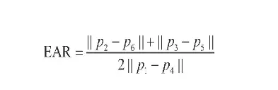 若相邻两帧之间眼睛宽高比的变化幅度(EAR)超过0.2,则可能指示驾驶员存在疲劳驾驶的情况。在68个面部特征点中,编号37至42对应左眼,43至48对应右眼。