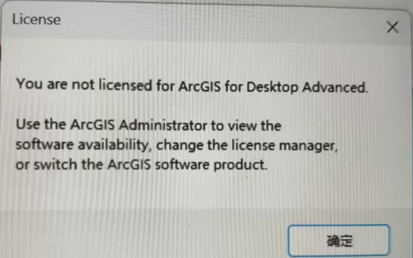 如图所示,当您打开 ArcGIS 软件时,会看到一个许可提示,内容大致为:“您没有 ArcGIS Desktop Advanced(高级版)的许可。请使用 ArcGIS Administrator(ArcGIS 管理员)来查看软件可用性、更改许可管理器,或切换 ArcGIS 软件产品。”
