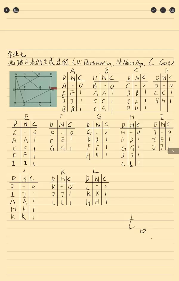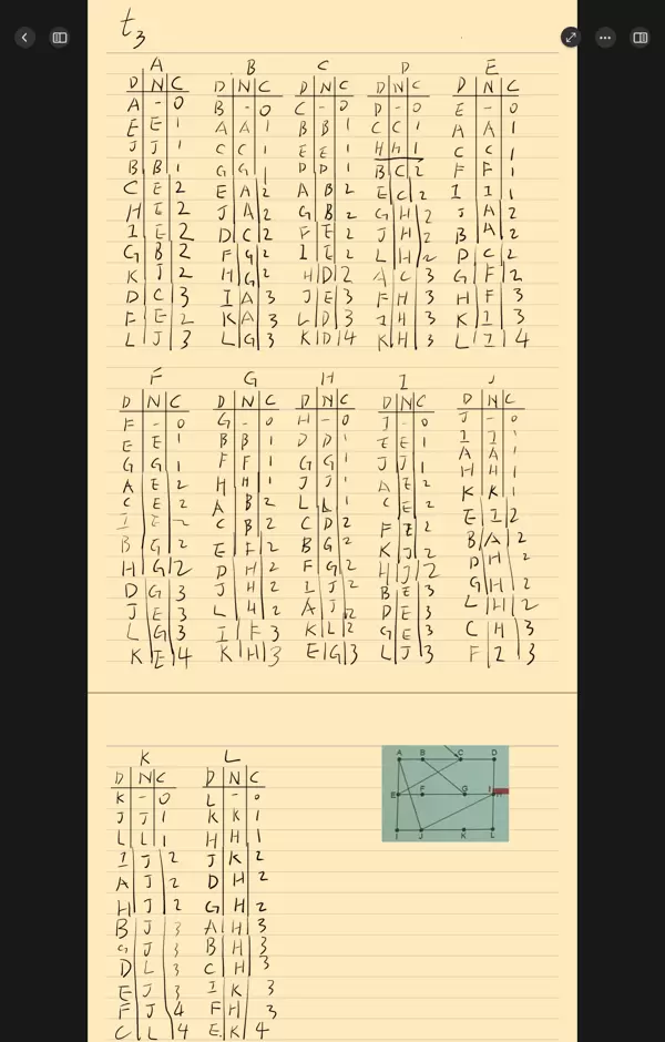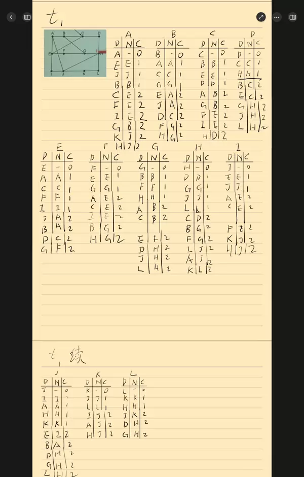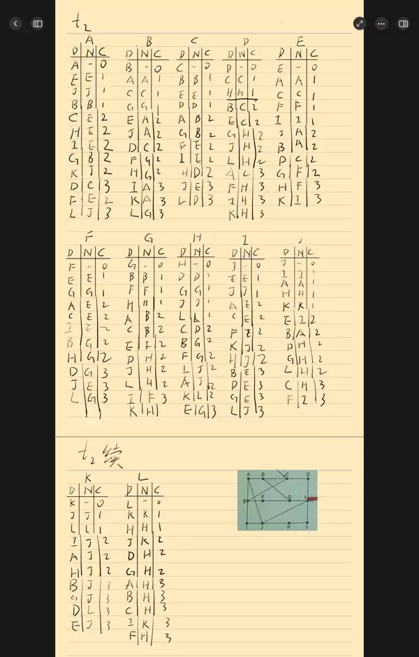 以一个具体例子来说明:假设当前时间点为t2,对于节点K而言,在t1时生成的J和L的路由表会被发送给K(当然,K的路由表也会被发送给J和L,这是一个双向过程)。原本,从K到B的路径是不存在的。然而,J的路由表告知K,从J到B的距离为2;而L的路由表则表明从L到B的路径不存在。因此,K会在其路由表中新增目标节点B,下一跳设为J,总成本为1+2=3(因为从K到J的成本为1,从J到B的成本为2)。