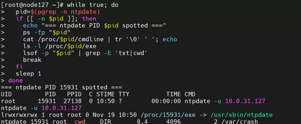 在某些情况下,可能有其他脚本或进程定期运行 ntpdate -u 10.0.31.127 命令,导致时间被强制同步。为了捕获这些进程,可以使用以下方法: