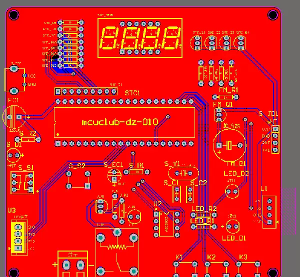 基于上述原理图生成,多数元件封装由开发者自定义完成,但并未公开封装库,而是直接提供了已连接完毕的源文件。PCB板中心位置印有项目编号,该编号位于单片机插座下方,在安装单片机后将不可见。PCB同样为双层设计,上下表面均覆盖铜箔以实现接地功能。