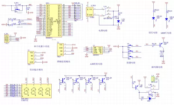 - 利用MQ-3传感器与ADC0832协同工作来检测空气中的酒精浓度,精度至小数点后一位。一旦检测到的酒精浓度超过预设的最大值,系统将激活红色警示灯,触发蜂鸣器警报,并通过继电器启动风扇以降低室内酒精浓度。若酒精浓度处于正常范围内,则点亮绿色指示灯。