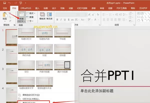 - 随后,选择“开始”菜单下的“新建幻灯片”->“重用幻灯片”,