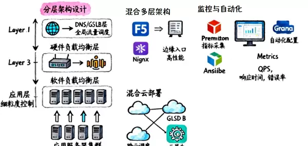 在实际部署中,没有一劳永逸的方案,而应采用分层架构和组合策略,充分发挥不同负载均衡技术的优势。通过硬件保障性能基线,软件提供灵活性,DNS/GSLB实现全局调度,最终构建一个高可用、高性能、易扩展的负载均衡体系,这是支撑现代分布式系统的最佳实践。