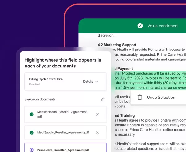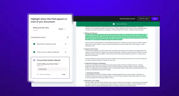 以采购团队为例,自定义提取功能能够帮助他们快速识别未充分利用的 SLA(服务水平协议)信用机会。只需几次点击,AI 引擎 Iris 就能定位哪些主服务协议(MSA)包含软件正常运行时间承诺及相关补偿条款。只需上传几份示例合同,并标注条款出现的位置,Iris 便能在未来自动完成识别。