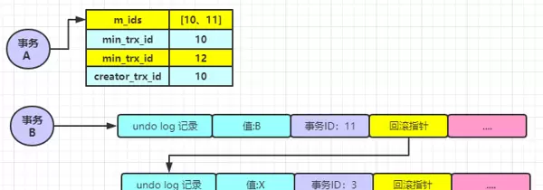 假设有两个事务 A 和 B,事务 ID 分别为 10 和 11。事务 B 先行启动并将数据从原始值 X 修改为 B。随后,事务 A 执行一次查询操作。
