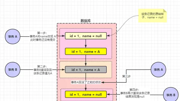 例如:事务 A 修改了 id 为 1 的记录 name 为 A,但还未提交;此时事务 B 查询该记录,读到了“A”这个值,并基于此进行后续逻辑处理。然而事务 A 随后回滚,name 恢复为原始值。这时事务 B 再次查询就会发现数据前后不一致,这就是典型的脏读。