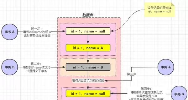 举个例子:假设有事务 A 和事务 B。事务 A 首先启动,并将 id 为 1 的记录 name 字段更新为 A(原值为 null),但尚未提交。紧接着事务 B 启动,也将该记录的 name 修改为 B 并立即提交。此时事务 A 决定回滚自己的更改。结果就是这条记录恢复为 null,导致事务 B 的修改“凭空消失”。