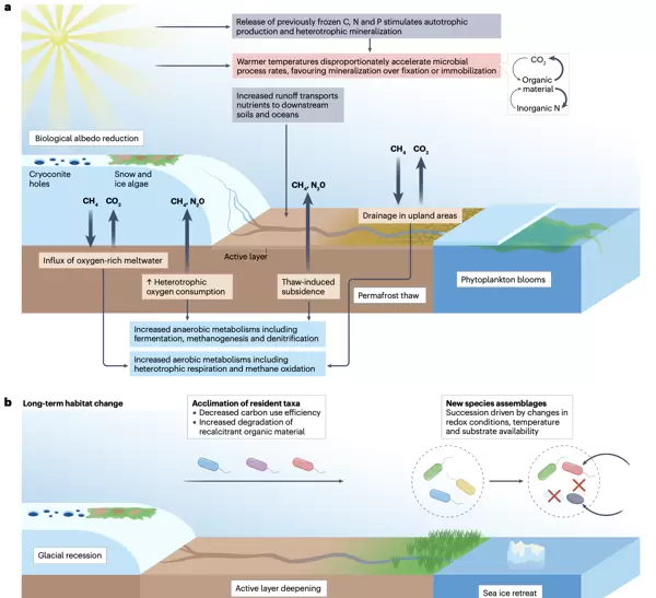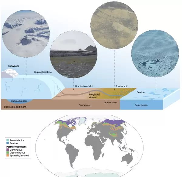 冰冻圈在全球碳氮循环中扮演着关键角色,储存了大量有机碳和营养元素。例如,多年冻土区域封存约1500 Pg的有机碳,而冰川与冰盖也固定了可观的碳与养分。随着气候变暖,这些储存库正面临多重扰动,微生物主导的生态过程随之发生显著改变。