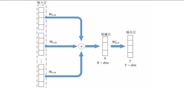 - 隐藏层:通过权重矩阵将one-hot向量投影为低维稠密向量,并对这些向量求平均;