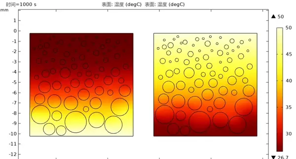 几何建模是第一步。构建一个二维矩形区域,在其中随机分布直径为0.5mm的圆形相变颗粒,整体孔隙率维持在0.7左右。实际操作中,手动排列颗粒效率低且难以保证均匀性,推荐使用COMSOL内置的随机分布函数生成器,并设置排除重叠的约束条件,以实现更合理的空间布局。