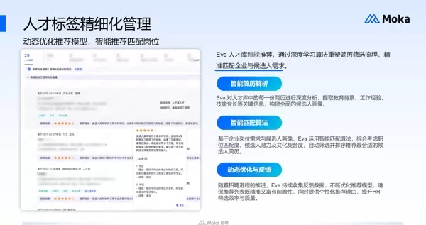 招聘管理模块贯穿从职位发布到新员工入职的完整流程,是企业获取高质量人才的核心引擎。其主要功能包括多渠道职位一键发布(覆盖主流招聘平台、校园招聘及内部推荐)、AI驱动的简历智能筛选(自动识别技能关键词并评估匹配度)、多方协作的面试调度机制(集成日历提醒与时间协调)、以及企业专属人才库的建设与激活(简历归档、定向召回)。Moka的招聘管理模块已实现超过10个主流招聘渠道的无缝对接,借助“候选人画像+职位画像”的双重匹配模型,显著提升人岗契合度。截至2025年初,系统累计处理简历达140万份,支持完成近40万场面试;并通过AI外呼技术唤醒沉睡简历,助力企业整体招聘效率提升超60%。