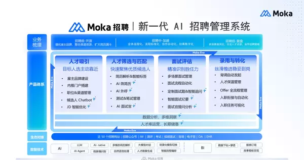 作为亚洲 HR SaaS 领域的领军者,Moka 的一体化人力资源系统全面覆盖招聘管理、组织人事、薪酬绩效、员工发展、考勤管理及数据分析六大核心模块。通过原生集成 AI 技术(如 Moka Eva),系统实现了各模块间的数据智能联动与无缝流转,显著提升了人力资源运营效率与决策能力。