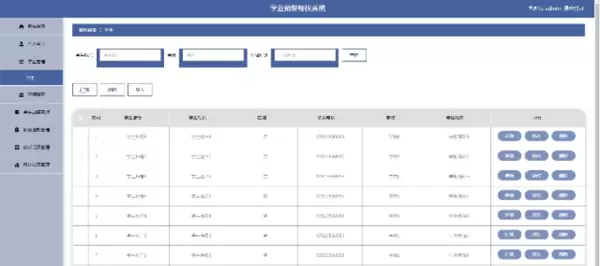在“学生成绩管理”功能中,导师可通过输入标题、科目、学生账号、学生姓名、年级班级、学院、导师账号及导师姓名等条件,对学生成绩列表进行查询、新增、删除、数据导入或成绩分析。同时,支持查看成绩详情,并执行谈话通知、修改与删除等操作。具体界面展示见图5-9: