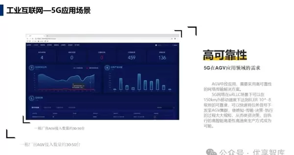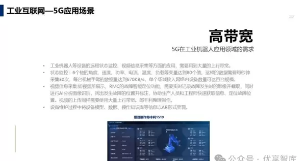 单机器人需处理30帧/秒×80变量数据,并叠加多路4K视频流,上行带宽要求达200–500 Mbps。借助5G eMBB大带宽特性,替代传统有线连接,灵活部署视觉检测节点。