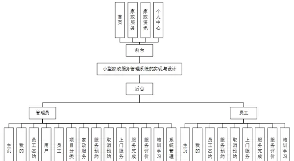 系统前台主要功能包括:首页展示服务概览,个人中心用于管理信息与预约;后台管理涉及员工签约、用户与员工信息维护、服务项目分类及具体家政服务展示;服务流程涵盖预约下单、取消预约、上门服务执行、服务完成确认等环节;同时支持服务评价收集用户反馈,并设有培训学习模块以提升员工能力;系统管理部分则负责后台数据的维护与配置。
