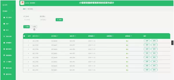 管理员主界面作为系统的核心控制台,集成了多个功能模块,如主页、我的、员工签约、用户管理、员工管理、项目分类、家政服务、服务预约、取消预约、上门服务、服务完成、服务评价、培训学习和系统管理等。界面布局清晰、功能分区明确,使管理员能迅速定位所需操作,高效完成日常管理工作。