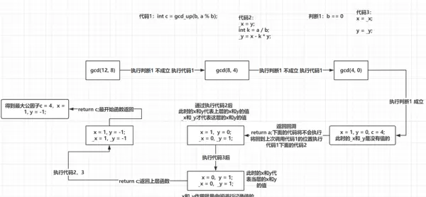 其中 k 是当前步的商(即 a / b 的整数部分)。基于此规则,可通过递归实现获取初始系数 x 和 y 的完整代码: