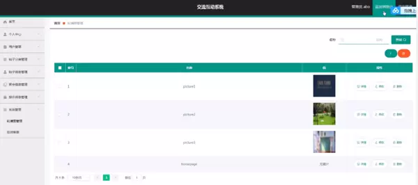 - 管理首页:展示关键数据统计,包括总用户数、发布帖子总量及待处理的报名申请数量;提供系统公告编辑功能和轮播图设置入口。