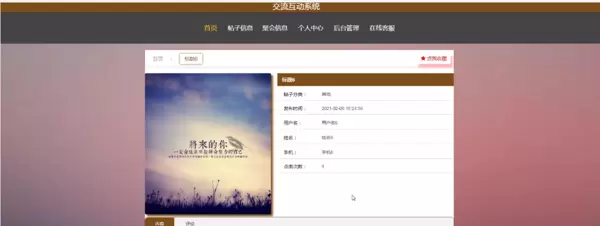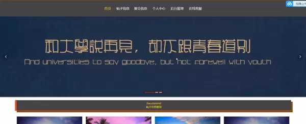 - 前台首页:集成轮播图用于推广热门内容,设有帖子分类导航栏、推荐聚会模块、在线客服通道,并保留后台管理入口跳转按钮。