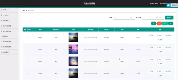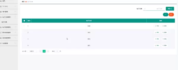 - 帖子管理页:显示全部帖子的标题、所属分类、发布者及当前审核状态;可执行通过或驳回操作,支持按分类筛选内容,并允许对帖子进行编辑或删除。