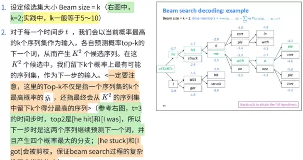 具体而言,在每个时间步,算法会扩展当前所有候选序列的可能下一个词,重新评分后筛选出总体得分最高的 k 个序列进入下一阶段。这个过程持续进行,直到达到预设终止条件。