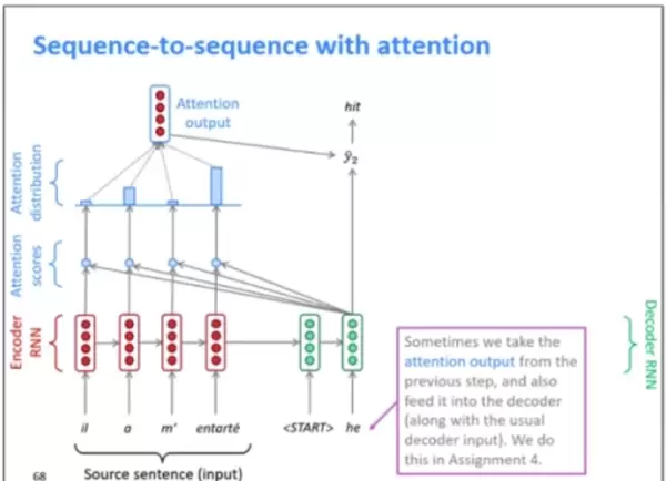 从图示可以看出,在生成"he"时刻的输出时,模型的注意力主要集中在编码器的第2和第4个输入词上,最终促使解码器决定输出“hit”这一结果。