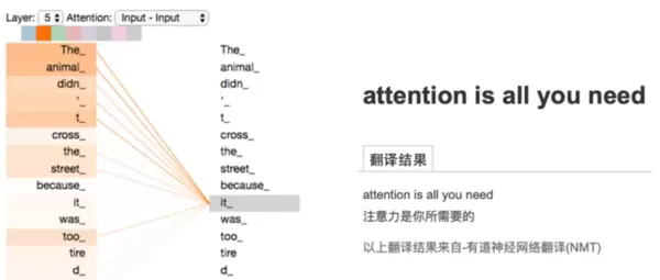 考虑如下句子的翻译任务:“The animal didn’t cross the street because it was too tired”。其中,“it”到底指代的是“street”还是“animal”?通过下图可以看到,当解码器处理“it”这个词时,Attention机制能够将其与“The animal”建立关联,并将这部分信息融入当前的编码过程。