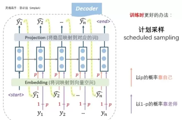 为此,Scheduled Sampling 提出了一种折中方案:设定一个概率 p,在每个解码时间步,以概率 p 使用模型自己上一步的预测结果作为当前输入,以概率 1-p 则使用真实标签值。随着训练进程逐步降低 p 值,实现从“依赖老师”到“独立完成”的平滑过渡。
