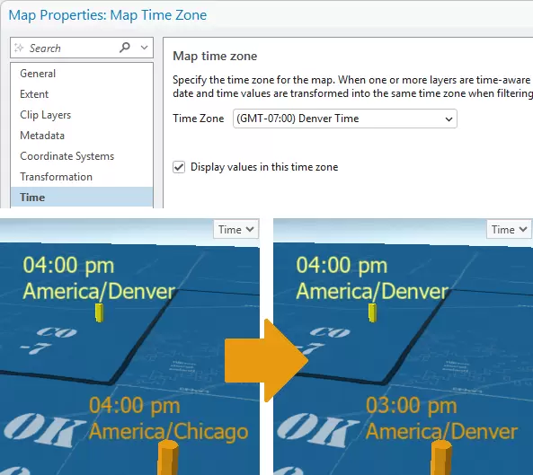 为简化跨时区时间数据的处理流程,ArcGIS Pro 3.6 新增了基于地图时区显示日期时间的功能。 用户可在地图时间属性中设置统一的时间参考系,使各图层的时间值自动对齐至同一时区,方便直接比较不同时区的时间信息。
