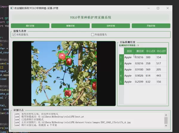 深度学习智慧农业YOLO苹果采摘护理定位辅助系统是一项融合计算机视觉与现代农业需求的智能解决方案,致力于提升果园管理自动化水平。系统通过YOLO目标检测算法精确定位苹果位置,结合PyQt5构建友好操作界面,支持多种识别模式,为采摘机器人或人工作业提供高精度空间指引。