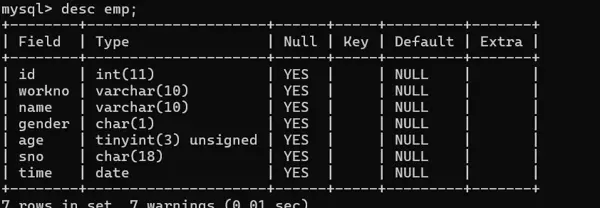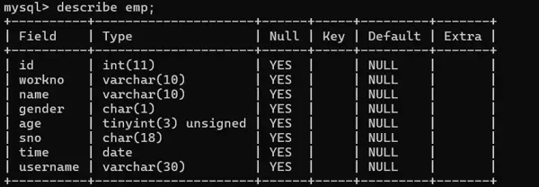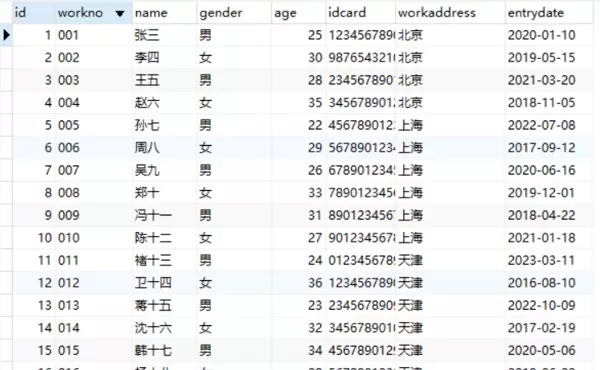 select id,workno,name,gender,age,idcard,workaddress,entrydate from emp;