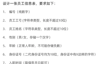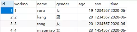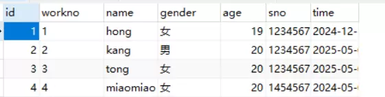 – 向指定字段插入数据 insert into employee(id,workno,name,gender,age,sno,time) values (1,'1','hong','女',19,123456789123456789,'2024-12-16'); – 查询表中全部数据 SELECT * from employee; – 插入完整字段的数据 insert into employee values (2,'2','kang','男',20,123456789456789123,'2025-05-06'); – 批量添加多条记录 insert into employee values (3,'3','tong','女',20,123456789456723123,'2025-05-06'), (4,'4','miaomiao','女',20,145456789456789123,'2024-05-06');