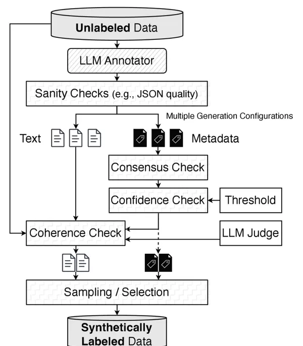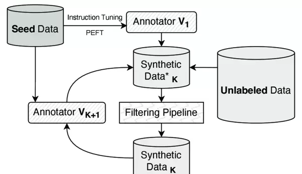 这一流程构建了一个闭环反馈系统,后续迭代持续利用前一轮经过筛选的输出作为训练数据,从而在保证输出质量的同时不断提升模型能力。随着合成数据质量的逐轮优化,最终获得性能增强的 LLM 标注器。