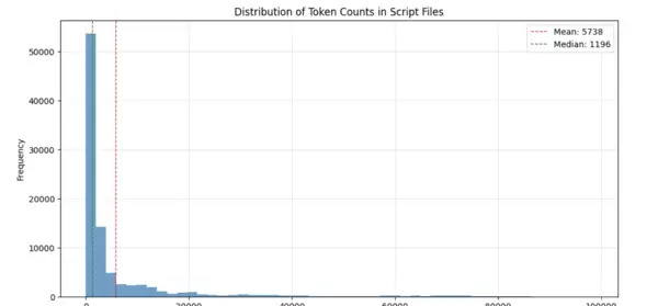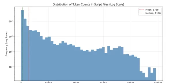 对于规模更大的V2训练集(约101,000个样本),其令牌分布趋势与种子集相似(见图10)。平均值上升至5,738,中位数为1,196。为更清晰地展示分布形态,图11以对数刻度重新绘制该数据,可见随着令牌数量增加,对应脚本频率呈指数级下降。这表明极长脚本仅占极小比例,因此上下文长度瓶颈的风险较低。