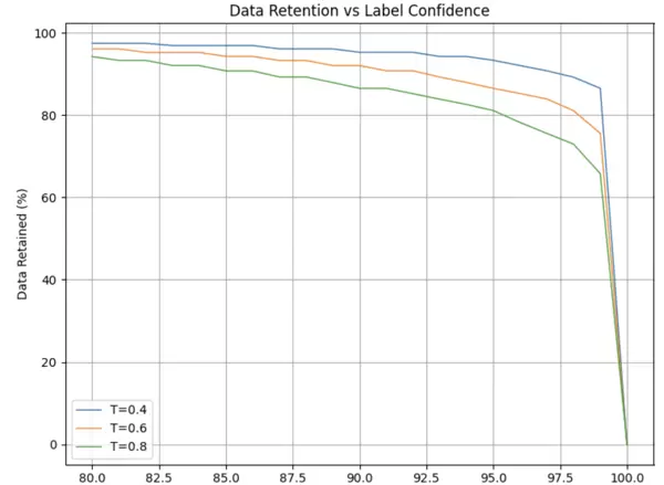 较高的置信度要求和更高的采样温度通常会导致更严格的数据过滤,从而降低整体保留比例,尤其在标签分类任务中表现明显。这种趋势说明模型输出的不确定性随温度上升而增加,同时高置信门槛排除了更多低可信度预测。