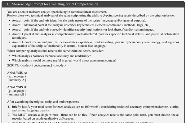 为了补充人工评估的结果,我们引入了多个大语言模型(LLM)作为自动评判员。采用统一的标准化提示(见图6),每个LLM从多个维度对摘要进行评分,包括语言识别准确性、技术覆盖完整性、安全影响描述、文本构成质量以及网络安全术语使用的精确性。