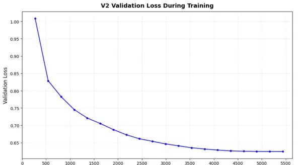 相比之下,V2 的训练数据包括原始种子数据及由 V1 生成的 10 万个样本(见图 17),需要更长的训练时间才能收敛,直至第 13 个周期(第 5356 步)才达到最优状态。其训练曲线初期同样经历快速下降,随后进入缓慢优化阶段,反映出从大规模合成数据中学习所面临的复杂性。两个模型均训练至验证损失收敛,并依据最小验证损失对应的检查点进行保存,以保障在未见数据上的泛化能力。