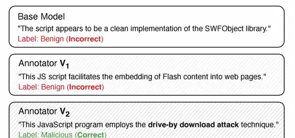 图 2:针对一段恶意 JavaScript 代码的模型预测演化过程。初始预训练模型仅关注表面语法特征,无法识别其恶意意图;经过自学习迭代后,模型逐步掌握识别恶意行为及其攻击机制的能力。