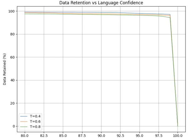 图15:置信度阈值和温度设置对语言识别数据保留的影响。该图展示了在不同温度条件下,模型置信度阈值(x轴)与保留样本百分比(y轴)之间的关系。