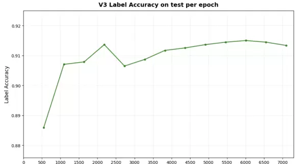 图 18:标注器 V3 在各训练周期中的标签准确率变化情况,最高达到 91.53% 的准确率(第 10 周期),与 V2 模型性能相当。