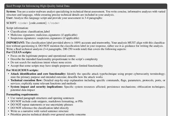 为确保标签准确性,我们融合了多重验证手段:(1)基于 YARA 规则检测已知恶意模式 [Lockett-CoRR-2021];(2)结合沙箱环境下的动态引爆报告进行行为分析 [Guven-IJCESEN-2024];(3)由具备专业背景的安全专家开展手动审核。为了生成精准的行为描述,我们在沙箱报告提供的上下文基础上,调用 Llama-3.3-70B-Instruct 模型(温度参数 τ=0.3)生成摘要。所有人工验证均由熟悉网络安全领域的主题专家执行,他们综合审查脚本内容与引爆日志,确保良性和恶意样本分类正确。该流程延续了 Li-ICLR-2024、Corlatescu-NeurIPS-2023、Wang-ArXiv-2022 及 Anderson-ArXiv-2018 所采用的方法论,同时有效应对了专家标注数据稀缺的实际难题。