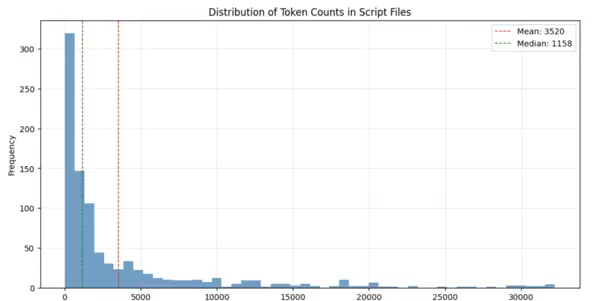 图8展示了包含900个样本的种子数据集中各脚本的令牌计数分布。结果显示,绝大多数样本远低于基础模型128k令牌的上限。平均令牌数为3,520,中位数为1,158,呈现明显的右偏分布。这意味着虽然大部分脚本较为简短,但存在少量极长样本。