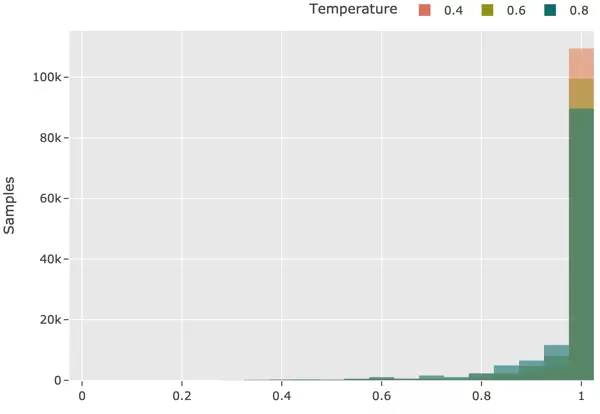 图13:标注器 V1 产生的分类标签令牌的概率分布。直方图基于模型原始logit输出计算得出,揭示了整个数据集上模型分类置信度的整体趋势。x轴表示概率区间,y轴表示各区间内出现频次。