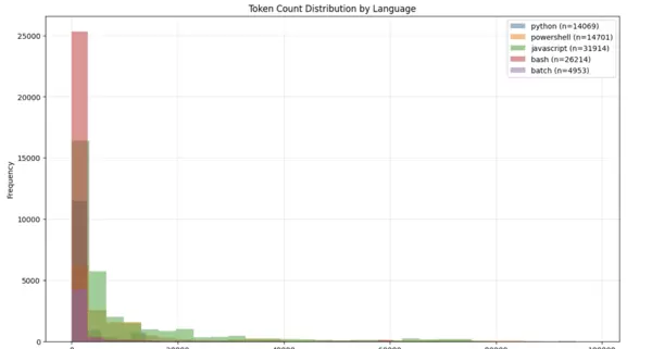 进一步按编程语言划分数据(见图9),不同语言在脚本长度上表现出明显差异。JavaScript样本普遍较长,个别甚至超过30,000令牌;PowerShell也包含较多高令牌数的实例。相比之下,Bash、Batch和Python脚本大多较短,集中分布在低令牌区间。