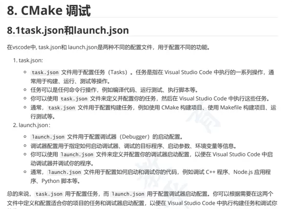 - tasks.json:定义构建任务,如执行 cmake 编译命令。
