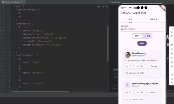 本阶段是在昨日完成的 GitCode 口袋工具基础之上进行的第二轮开发。当前已实现核心功能中的搜索模块与仓库列表展示,并成功对接 GitCode OpenAPI 接口服务。本轮迭代重点聚焦于用户体验优化及界面组件的模块化设计,提升整体可维护性与扩展能力。