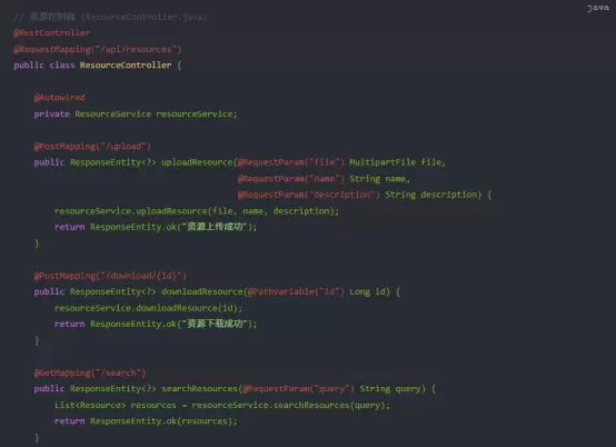 管理员具备审核权限,可对上传内容进行管控。系统通过Spring Boot暴露CRUD接口,资源元数据存储于MySQL数据库中,并支持按类别筛选与全文检索。