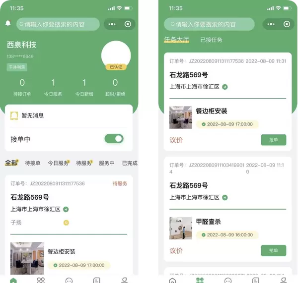 服务者可进入“任务大厅”,浏览周边待处理订单,结合自身技能与地理位置主动抢单,实现工作自主权最大化。