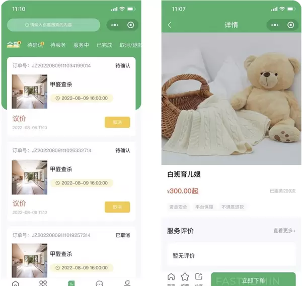 平台涵盖白班育儿嫂、甲醛检测与治理、月嫂服务、家电维修等多种家政项目。每项服务均明码标价,并展示历史完成订单数量,帮助用户快速判断服务质量。“立即下单”功能简化流程,实现一键预约。